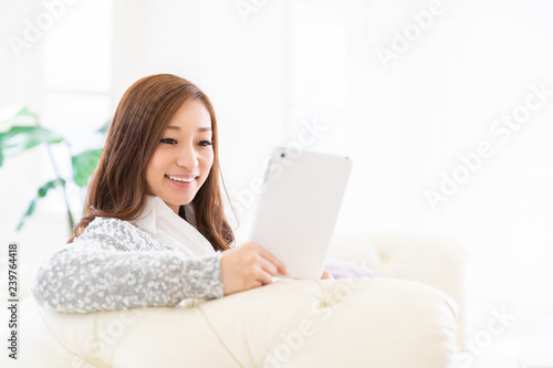 部屋でタブレットを見る女性