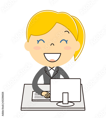 デスクトップパソコンの前に座っている黒いスーツの女性