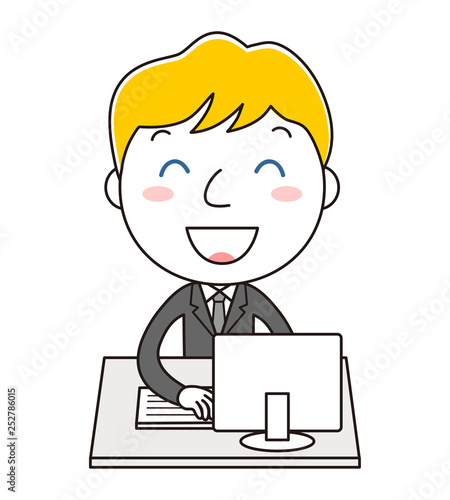 デスクトップパソコンの前に座っている黒いスーツの男性