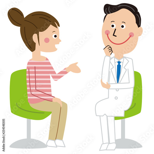 ポップな白衣の黒髪男性が若いの女性を診察