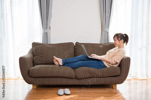 ソファに座ってパソコンを使う女性
