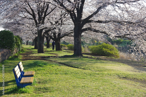桜の並木道とベンチ