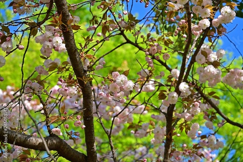 木漏れ日浴びて咲く淡いピンクの八重桜