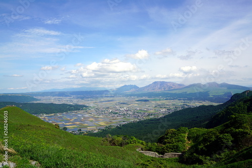 雄大な阿蘇外輪山から見た阿蘇市内と内牧温泉街の風景、春の阿蘇外輪山、