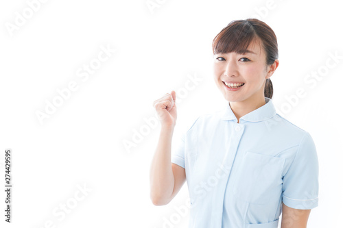 ガッツポーズをする若い看護師
