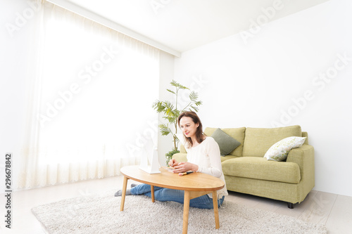 自宅で化粧をする若い女性