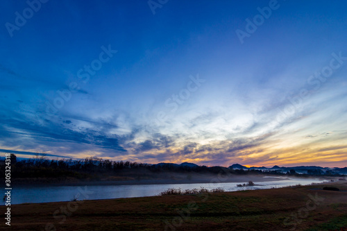 川の蒸気霧 初冬 夕方 川霧 自然現象