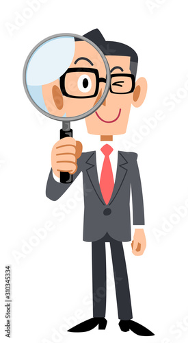 虫眼鏡を覗く眼鏡をかけたビジネスマンの全身
