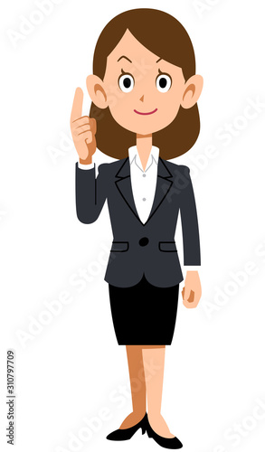 人差し指をたてるスーツの女性の全身