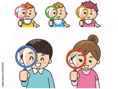若い夫婦と赤ちゃんが虫眼鏡で覗いている