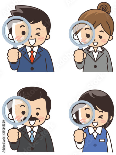 ビジネスマンとビジネスウーマンが虫眼鏡で覗いている