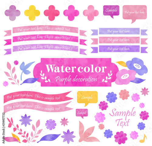 水彩テクスチャーのフレームデザイン リボンや吹き出し 見出しのセット