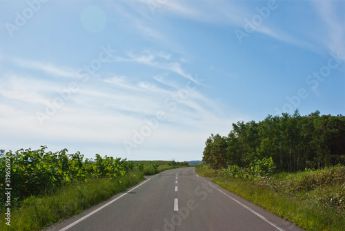 一本の道と青い空に浮かぶ雲と
