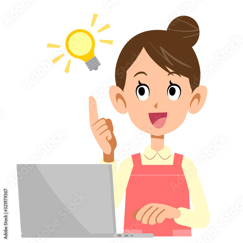 アイデアが閃くノートパソコンを操作するエプロンをつけた女性