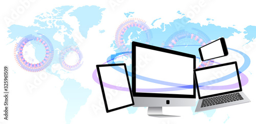 世界とつながるノートパソコンとスマホとタブレット-白背景