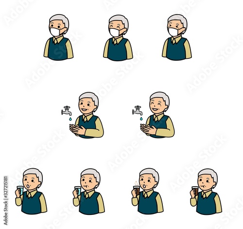 病気の予防のために手洗いやうがいやマスクをする高齢の男性