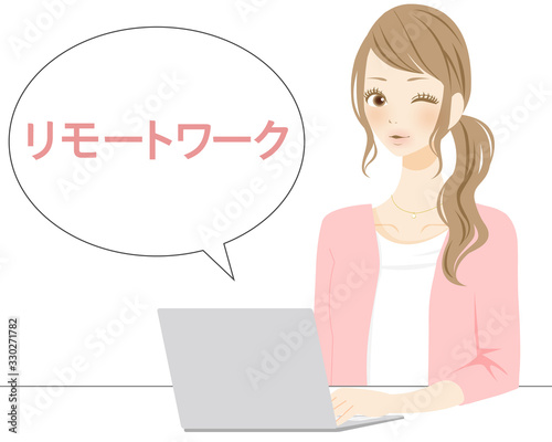 リモートで仕事をする女性 働き方改革 パソコン テレワークのイラスト 白背景