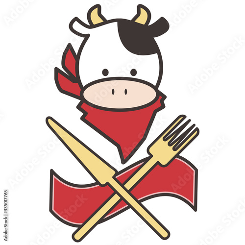 首にスカーフを巻いた牛とナイフとフォークのエンブレム