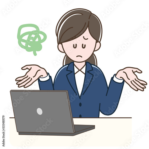 パソコンの前でがっかりするスーツの女性