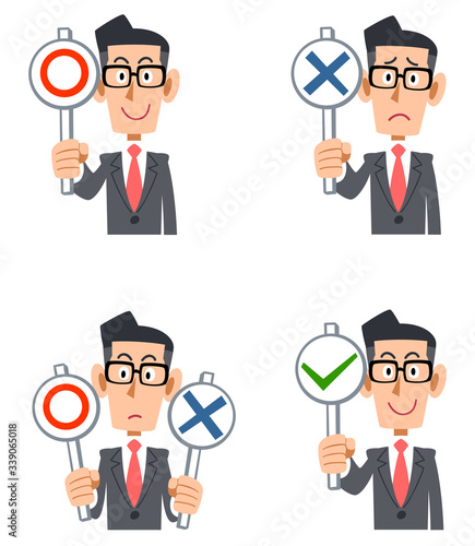 正解と不正解の札を持った眼鏡のビジネスマン