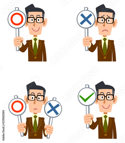 正解と不正解の札を持った茶色のジャケットを着る眼鏡の男性