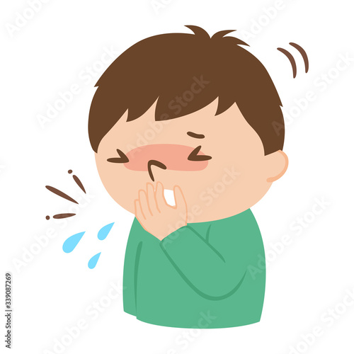 手で口を覆ってくしゃみをしている若い男性のイラスト。