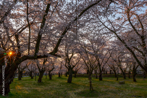満開の桜と太陽の日差し(光芒・光条)