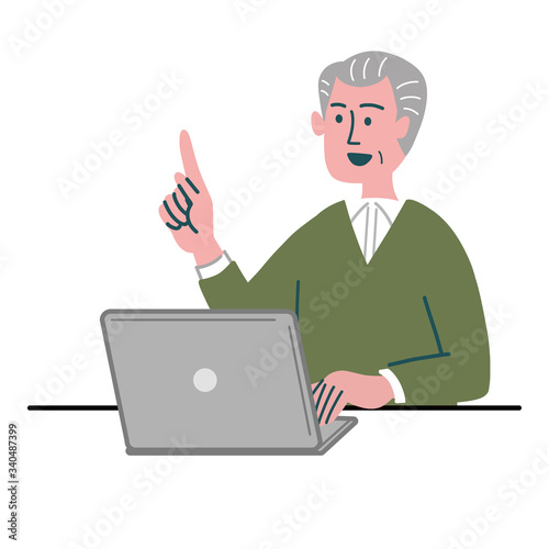 男性 シニア 主夫 パソコン 提案 人差し指を立てる