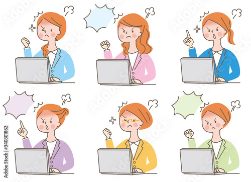 パソコン 怒る 若い女性 スーツ 表情セット