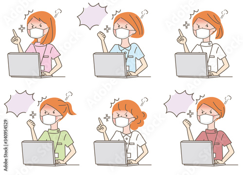 マスク パソコン 怒る 若い女性 白衣 人物セット