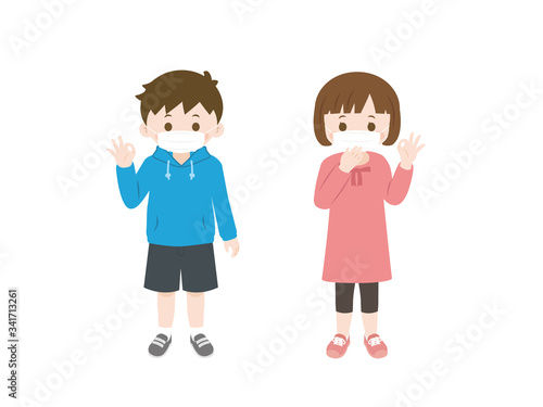 マスクをして外に出る子供達のイラスト