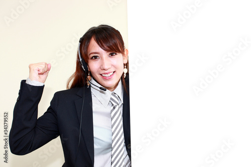 ホワイトボードとガッツポーズの笑顔のオペレーター