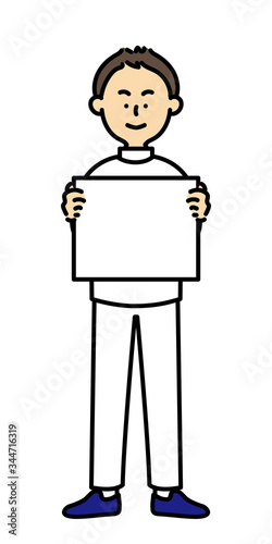 フリップ/メッセージボードを持つ白衣を着た男性