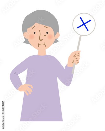 バツ印の札を持ったおばあちゃんの上半身ベクターイラスト