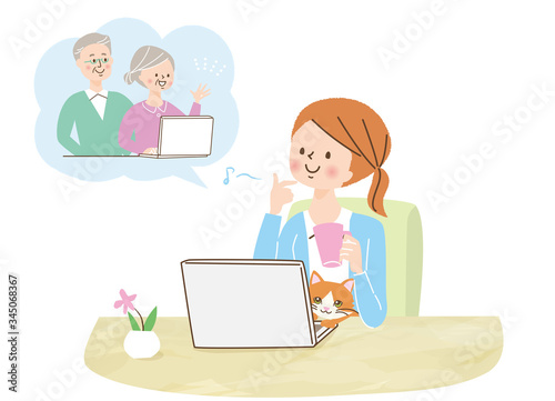パソコン 親子 若い女性 シニア 両親 オンライン帰省