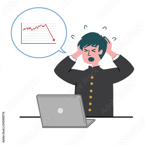 学ラン 学生 男性 パソコン グラフ 下降 困っている