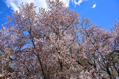 青空バックに咲く満開のベニバスモモ