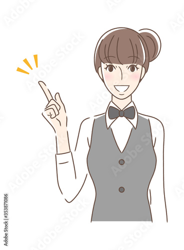 笑顔で指をさす正面向きの女性