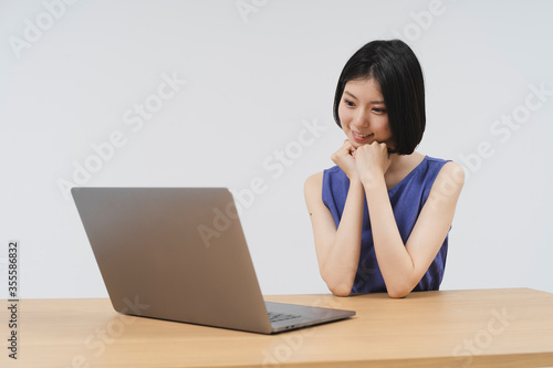 personal computer, notebook, telecommuting, online, business, cyberspace, soho, young, woman, japanese, people, smile, student, work, copy space, mail, beauty, sweet, home, pretty, clean, lovely, asian, lifestyle, network, communication, communication, digital, technology
