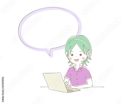 man, personal computer, people, telecommuting, notebook, earphones, microphone, call, online, smile, business, personal computer, working, speaking, japanese, operator, soho, isolated, young
