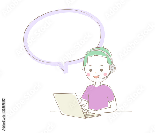 man, personal computer, people, telecommuting, notebook, earphones, microphone, call, online, smile, business, personal computer, working, speaking, japanese, operator, soho, isolated, young