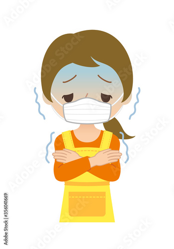 マスクとエプロンをした体調不良で悪寒がする主婦