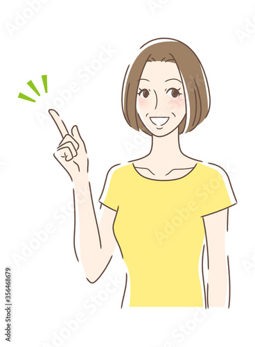 笑顔で指をさす女性
