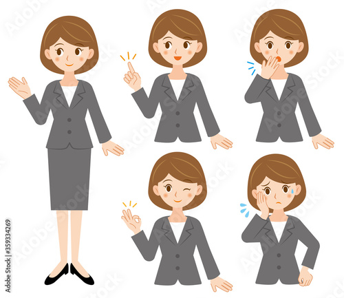 ビジネススーツ女性表情ポーズイラストセット/白背景