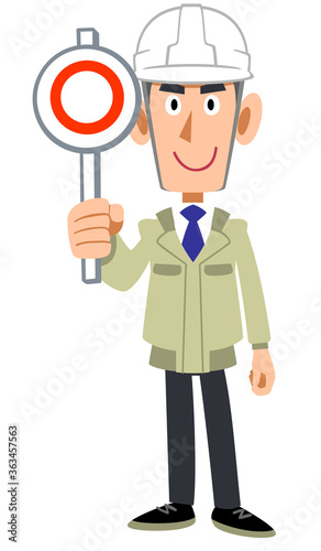 丸が描かれた札を掲げるヘルメットを被った作業着の男性