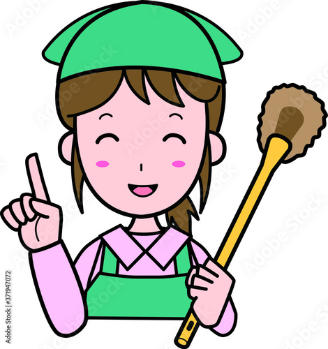 トイレ掃除用ブラシを持って指をさす、家事代行業の若い女性スタッフ