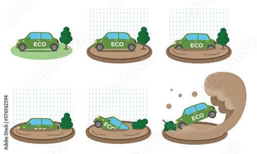水害に遭う緑のエコカーのベクターイラストセット