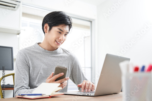 私服で在宅ワークをする日本人男性ビジネスマン