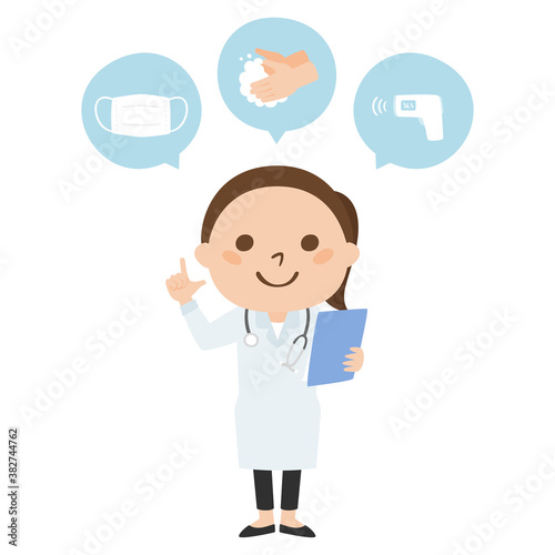 女性の医者。コロナウィルスの感染予防対策のイラスト。