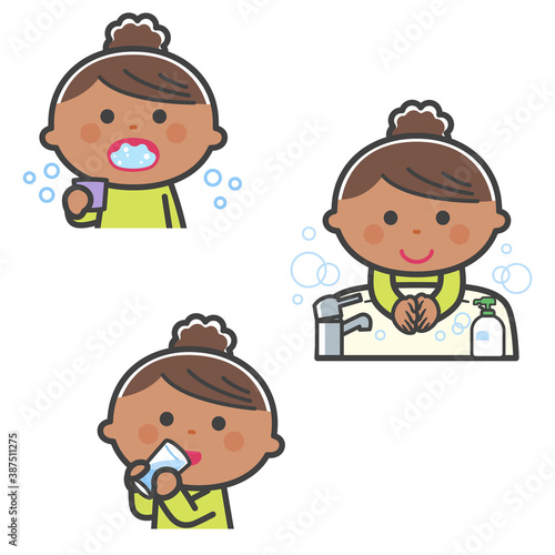 感染症予防/うがい、手洗い、水分補給をする女の子/線あり